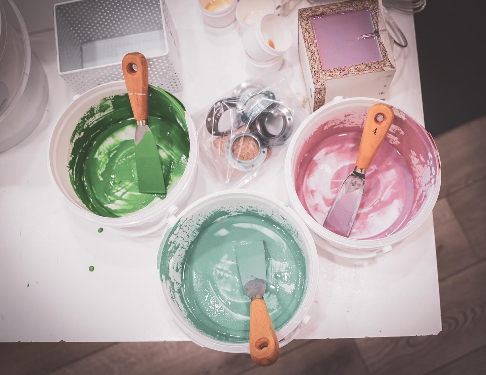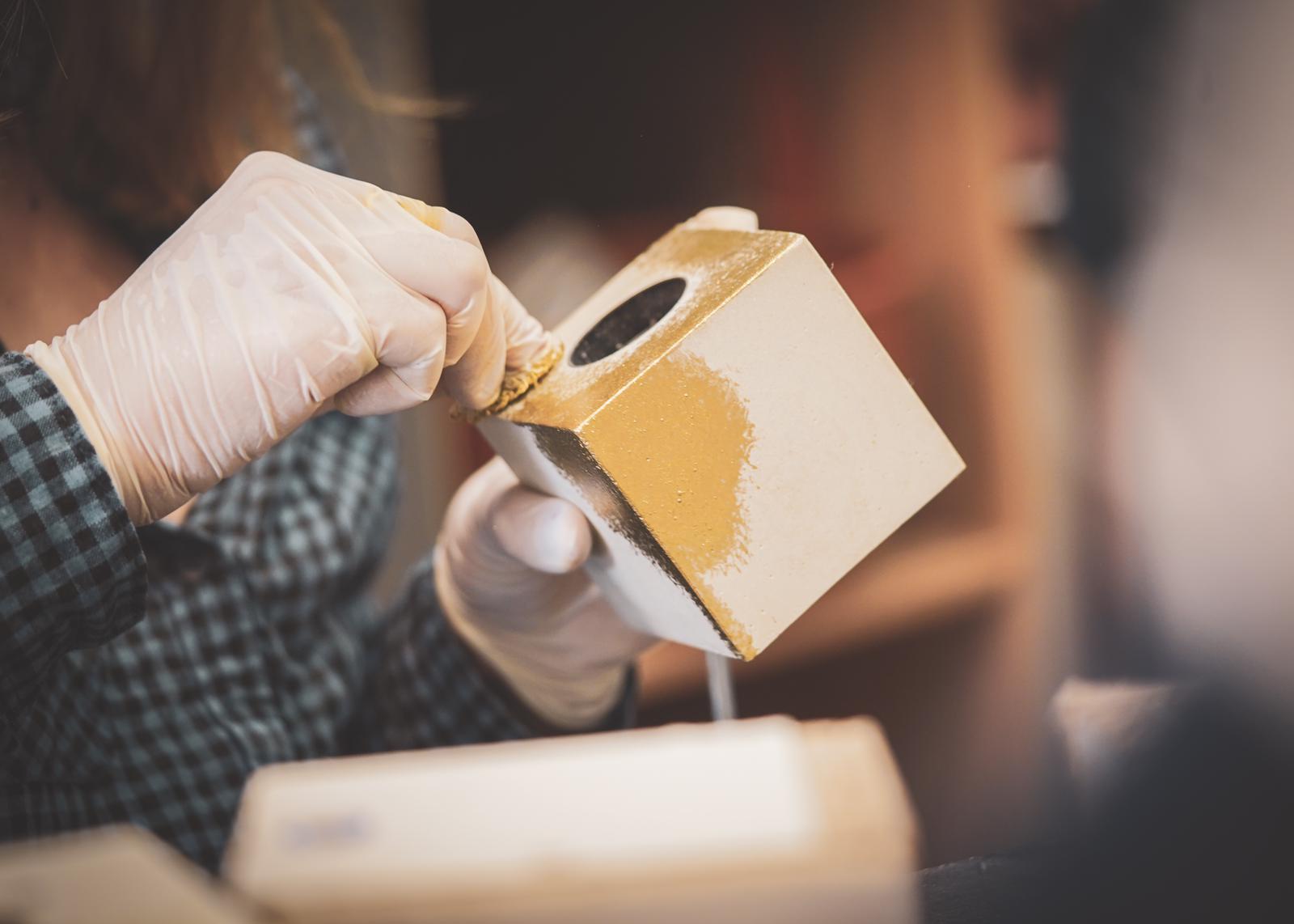 Une fois la lampe démoulée, la dernière étape est celle de l'application d'une cire satiné spéciale béton. Cette cire permet à la fois de protéger le béton mais également de lui apporter de la brillance. Cette cire est appliquée au pinceau.