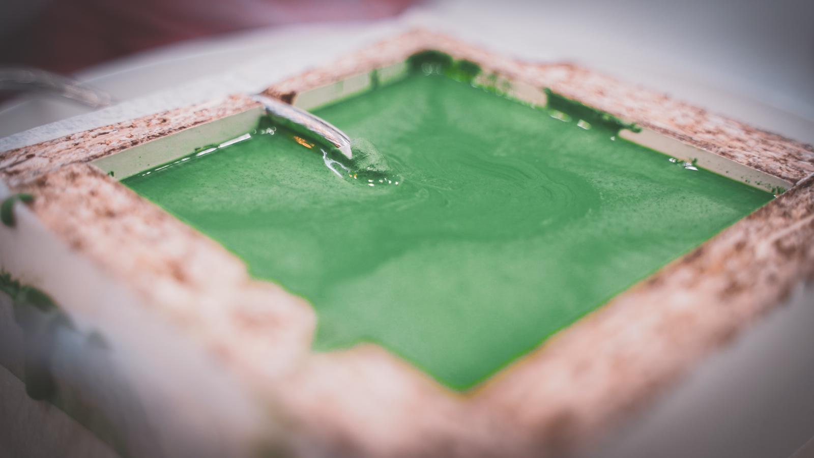 Avant le couler le béton à l'intérieur du moule, il est indispensable de huiler le moule avec une huile de décoffrage. Cette étape permet par la suite de faciliter le démoulage de la lampe. Comme lorsque vous faites un gâteau, vous beurrez le moule, ici c'est pareil ! Puis vient le moment de fabriquer son béton. Le béton est un mortier coloré dans la masse par des pigments naturels. Ce béton est par la suite mélangé à de l'eau afin de créer une pâte homogène. Le béton est versé dans le moule.
