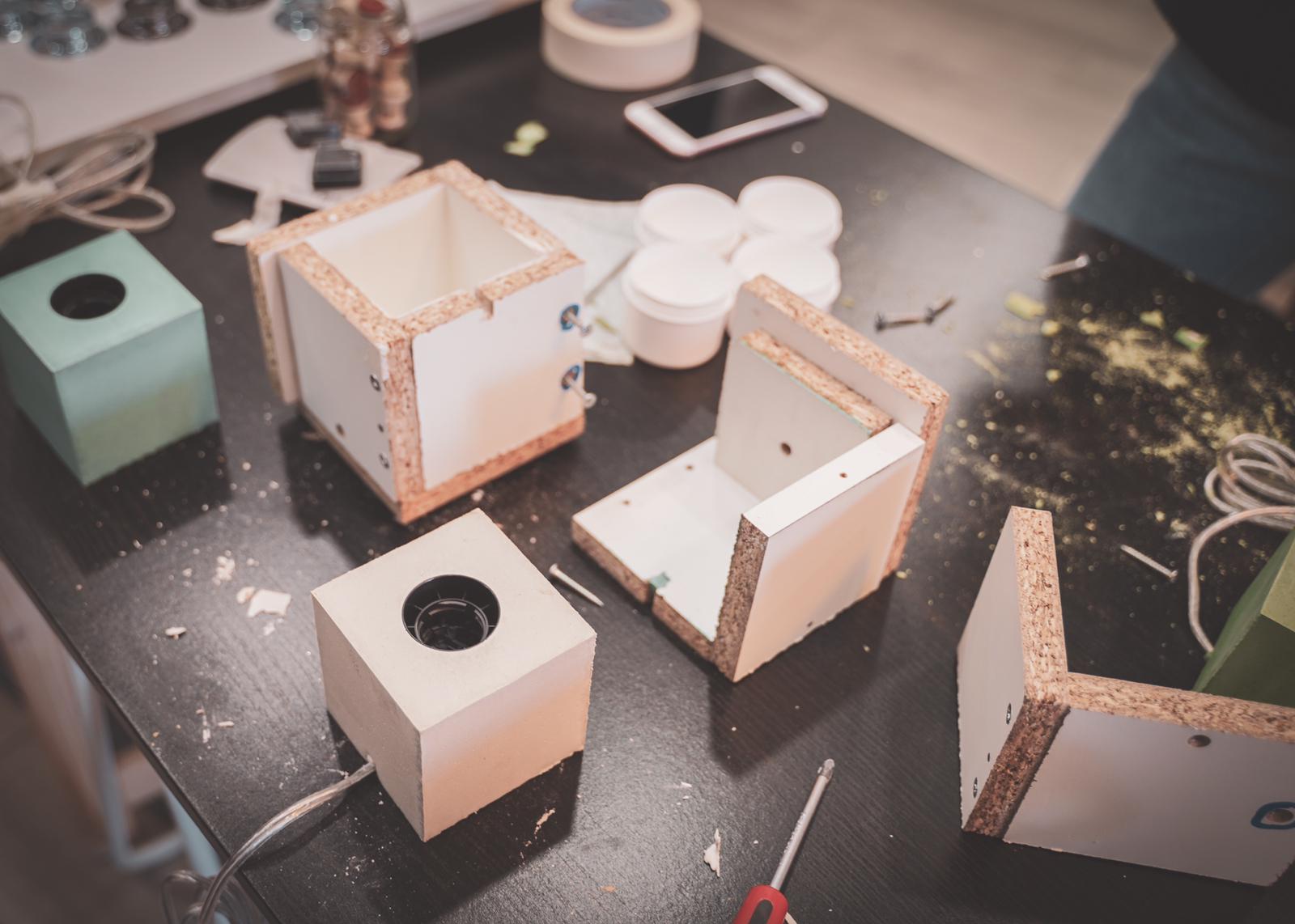 Nos luminaires en béton sont fabriqués grâce à la technique du moulage. Nous fabriquons des moules où nous venons couler le béton dedans. Ces moules sont soit des coffrages en bois pour les formes cubiques, soit des moules en silicone, plastique pour les formes de lampes plus arrondis.